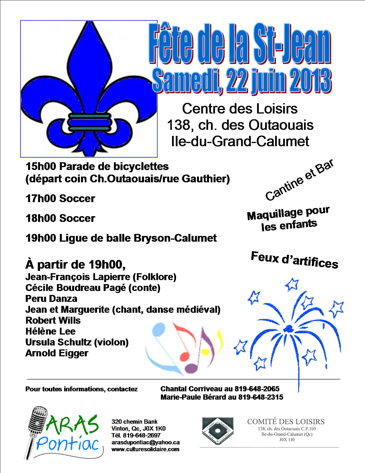 ARAS Pontiac était très heureux de participer pour la première fois à l’organisation de la Fête de la St Jean de l’Ile du Grand Calumet avec le comité des loisirs de l’Ile. Nous remercions les membres du comité pour leur confiance et les artistes d’êtres venus pour agrémenter cette soirée et cette belle célébration !