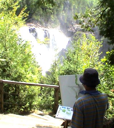 Beau soleil. Nous partons Clément, Gabrielle, Philippe et moi aux Chutes Coulonge. Le haut lieu touristique du Pontiac. Une magnifique chute d’eau ou jadis des billots de bois flottaient depuis les forêts du Pontiac jusqu’à Ottawa en prenant la rivière des Outaouais. Clément et moi, nous nous sommes installés dans un coin et avons commencé a peindre et dessiné la vue des Chutes.